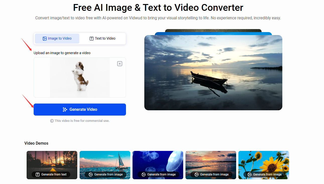 This is not the end of combining images. For those who want to take their static composite images to the next level, create dynamic videos with Vidwud Image to Video. This online free tool features a simple layout that makes video generation a breeze. Simply upload an image or enter text and get a stunning dynamic MP4 video with a single click. How fast can it be? Follow the steps below to witness this magic.